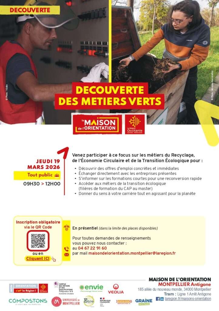 La Région Occitanie / Pyrénées-Méditerranée organise, en lien avec l’Université de Montpellier, France Travail et de nombreux autres partenaires, une matinée « Découverte des métiers verts » avec un focus sur les métiers du Recyclage, de l’Économie Circulaire et de la Transition Écologique.